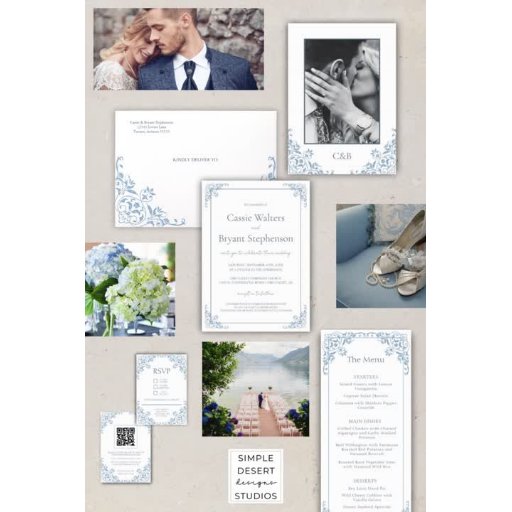Crea una invitación tan atemporal como tu amor por este romántico Shabby Chic Blue and White Boda que exudan la combinación perfecta de elegancia simple con una moda costera y estética de dinero viejo. El versátil diseño es perfecto para la pareja que está creando un tema romántico con una combinación clásica de escritura caligráfica y tipografía y un elemento gráfico vintage ligeramente retro. Diseñado por Simple Desert Designs Studio. Envíenos un mensaje para que los colores más personalizados coincidan con su color o esquema de color específico.