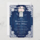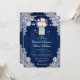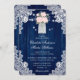 Rústica invitación a bodas floridas de color azul marino y rubor con un ramo de rosas y flores de aliento de bebé dentro de un frasco de albañilería contra un fondo de madera de granero adornado con encajes florales blancos y luces de cuerdas. Diseño perfecto para invitar a sus invitados a su fiesta de bodas rústica azul marino y ruidosa. Personalice fácilmente esta invitación de boda con los detalles de su boda en línea. Diseño de personalizable completo. Elementos coincidentes disponibles.
