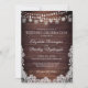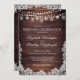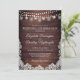 Hermosa madera de granero oscuro de campo con luces de cuerda, linternas fiestas y tarros de albañil acentuados con encaje blanco y elegante tipografía de escritura. Todo el texto es editable para cambiar la redacción de manera que se ajuste a sus necesidades. Póngase en contacto con el diseñador a través de Zazzle Chat o makeitaboutyoustore@gmail.com si desea modificar este diseño, en otro producto o en elementos de coordinación.