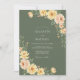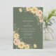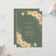 Este diseño presenta un rico fondo verde oliva que establece un tono sombrío y a la vez terroso. Racimos de rosas de melocotón y flores doradas están dispuestos con delicado follaje verde. El estilo de acuarela crea una atmósfera romántica y rústica, perfecta para un evento al aire libre o de otoño.