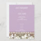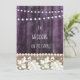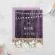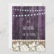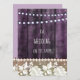 Plantilla de invitación de boda rústica con encaje vintage y una pared de madera de granja antigua en tonos púrpura suaves. Las luces de cuerda añaden un encanto acogedor, lo que la hace perfecta para bodas, fiestas de compromiso, compromisos, salvar la fecha y aniversarios. Incluye diseño frontal y posterior de Alma Wad. Totalmente personalizable para adaptarse a su evento.