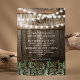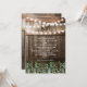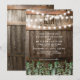 Invitación de boda rústica con vegetación que presenta un granero campestre, fondo de barril de roble oscuro, luces de hadas, monograma personalizado, follaje botánico verde y una plantilla de boda moderna fácil de personalizar.