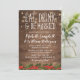 Invitaciones de boda con tema de Navidad rústica que presentan un cálido fondo de madera, luces de hadas, un borde floral de acebo de Navidad, las palabras "COME, BEBE Y CÁSARE" y una plantilla de boda personalizada.