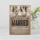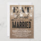 Estas caprichosas invitaciones de boda campestres vienen como un conjunto de boda a juego con un efecto de fondo de arpillera marrón rústica, luces de hadas elegantes en cuerda de tarro de mason, las palabras "COME, BEBE Y CÁSATE" y los detalles de su boda.