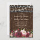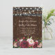 Invitaciones de boda con tema campestre con un telón de fondo de barril de madera rústica, luces de cuerda, un ramo de flores de acuarela en rojo, borgoña y rosa, y una hermosa plantilla de boda.