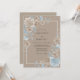 Este diseño presenta un cálido fondo bronceado adornado con suaves flores de acuarela en tonos de azul polvoriento y crema. Delicadas rosas y exuberantes peonías se agrupan hermosamente, creando una estética romántica y terrenal. La paleta evoca un ambiente vintage sereno, perfecto para una boda rústica al aire libre o en un granero.