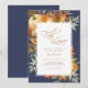 Una elegante Invitación rústica de otoño con un magnífico follaje acuático y un diseño de calabaza. Los colores naranjas quemados en tierra complementan el color de fondo azul oscuro de esta tarjeta. La frase 'Caer en amor' aparece en una bonita y elegante fuente de escritura. Esta invitación está lista para que usted pueda personalizar con sus propios detalles para invitar a sus invitados a su día especial.