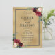 Planilla de invitación a boda floral rosa rosa rosa y color de agua rojo burdeos con marco dorado y letras doradas con follaje botánico verde y hojas de eucalipto en fondo azul marino. Este hermoso diseño fácil de personalizar puede coincidir fácilmente con sus colores, estilos y temas bodas y es una elección perfecta para bodas de otoño o invierno. Puede encontrar más diseños coincidentes de mi tienda o contactarse conmigo si necesita ayuda en la personalización del diseño.