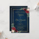 Planilla de invitación a boda floral rosa rosa rosa y color de agua rojo burdeos con marco dorado y letras doradas con follaje botánico verde y hojas de eucalipto en fondo azul marino. Este hermoso diseño fácil de personalizar puede coincidir fácilmente con sus colores, estilos y temas bodas y es una elección perfecta para bodas de otoño o invierno. Puede encontrar más diseños coincidentes de mi tienda o contactarse conmigo si necesita ayuda en la personalización del diseño.