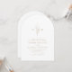 Invitación minimalista a una boda en arco de color blanco y oro, con sus iniciales monogramadas y hojas botánicas ilustradas a mano en la parte superior, los detalles del evento se muestran a continuación en escritura moderna y letra clásica. Sencillo y lujoso. Ideal para bodas clásicos modernos, boda formal simple, elegante boda botánica. Vea todas las piezas coincidentes de la colección.