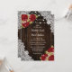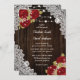 Esta elegante invitación a una boda floral con rosas rojas y aliento de bebé en un marco de madera de granero y encaje es perfecta para invitar a sus invitados a su fiesta de bodas rústica y roja.