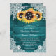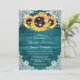 Elegante invitación rústica a la boda verde azulada y girasol, ideal para una verde azulada fiesta rústica de campo, patio trasero, jardín o boda de granero inspirada en las flores de girasol. Los objetos a juego se complementan con esta verde azulada tarjeta boda rústica con girasoles sobre un fondo rústico de madera adornada con encajes florales blancos y luces de cuerda.