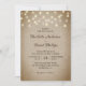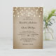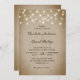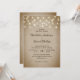 Sencillas invitaciones rústicas a bodas en burún con luces de cuerda sobre un fondo de burpón vintage son perfectas para invitar a sus invitados a su rústico país, patio trasero, jardín o fiesta de bodas en granero.