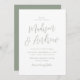 Las invitaciones minimalistas a la boda con sus nombres mostrados en un sencillo guión verde salado con los detalles de su boda que se muestran a continuación. La invitación vuelve a un fondo verde de sabio sólido.