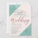 Elegante, moda y glamorosos trajes impresos verde azulados esquinas de secuencia de purpurinas azules y escritura rosa de oro en un fondo rosa claro, Invitaciones de boda. Este diseño clásico y sofisticado es perfecto para una pareja casera moderna y elegante. Personalice con su propio mensaje en la parte delantera, así como un monograma inicial personalizado en la parte posterior. Todo el diseño de impresión fotográfica.