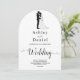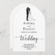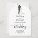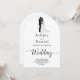 Esta elegante invitación a la boda en arco blanco y negro es perfecta para un boda moderno. El diseño es sencillo y cuenta con una elegante caligrafía negra y un ilustracion de novios sobre un fondo blanco y limpio. La tarjeta de invitación incluye los detalles del boda en la parte posterior en lugar de pagar por una tarjeta separada.