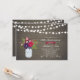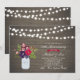 Celebre su día especial con esta elegante invitación de aniversario sorpresa. Este diseño presenta luces de cuerda, ramo de flores de colores de otoño (rojo y púrpura) con un frasco de mason sobre un fondo de madera rústica. Puede personalizar el texto para cualquier edad o evento. Agregue las iniciales de la pareja en el corazón en forma de gráfico de frasco de mason.