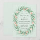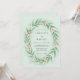 Este diseño presenta un suave fondo verde menta adornado con una delicada corona de hojas verdes y flores de durazno pálido. La estética de acuarela etérea crea un ambiente romántico y sereno, perfecto para un evento al aire libre en primavera. La paleta se centra en tonos pastel y elementos botánicos naturales para evocar un sentido de elegante gracia.
