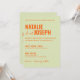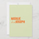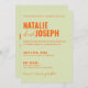Esta invitación a la boda es perfecta para su boda si busca un diseño único y fácil de editar.Una elegante y sencilla invitación a boda de naranja verde minimalista. El fondo es verde claro y claro. Y naranja negrita los nombres elegantes de novia y novio. e información editable con nombres también en la parte de atrás. Asequible y también es una invitación electrónica digital si quieres enviarla por mensaje de texto o correo electrónico. Toda la información es personalizable haciendo clic en el botón de personalización. Así que agárralo y hazlo tuyo para que invites comprometidos y emocionados.