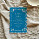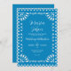 Este diseño mexicano de la invitación tradicional a la boda de bodas con papel azul muestra un impresionante borde inspirado en el picado, de un azul intenso, con bordes de vieiras y motivos recortados. El patrón decorativo incluye formas simétricas de hojas florales en las esquinas y rollos ornamentales en los bordes superior e inferior, evocando el arte folclórico tradicional mexicano. El espacio central es de color azul sólido, enmarcado con gusto por estos detalles intrincados, lo que lo hace ideal para dominar textos o ilustraciones.