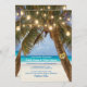 Invitaciones nupciales de destino con un entorno tropical paradisíaco en la playa, con una exuberante palmera, sus iniciales grabadas en un corazón esculpido y luces de cuerdas.