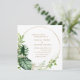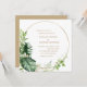 Moderna invitación a bodas botánicas cuadradas con sus detalles en el interior de un marco de círculo geométrico rodeado de vegetación tropical pintada de acuarela y falsas hojas de oro. Tus detalles y tu trasero están en un tono dorado a juego. Estas elegantes invitaciones son perfectas para una boda de verano en una zona tropical.