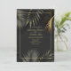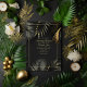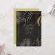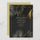 Invitación a bodas tropicales con aspectos de negro y oro.