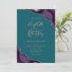 En dos esquinas de este elegante diseño aparece un diseño de agate color morado con purpurina de oro falso. Personalízalo con los nombres de la pareja en un guión de escritura a mano de color dorado sobre un gran ampersand. Agregue los detalles del boda en copperplate de color dorado y tipografías cursivas en un fondo azul verde azulado. El reverso presenta un diseño de agate morado y dorado a juego.