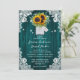Invitación a una boda verde azulada rústica con un ramo de girasol en el interior de un frasco de albañil, con un fondo rústico de madera adornado con encajes florales blancos y luces de cuerdas. Diseño de tarjetas perfecto para invitar a sus invitados a su fiesta rústica de boda verde azulada inspirada en los girasoles.