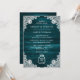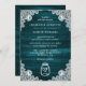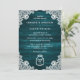 Invitación rústica a la boda verde azulada con un frasco de albañil sobre un fondo rústico de madera adornado con un encaje floral blanco. Personalice fácilmente esta rústica invitación verde azulada a la boda para complementar su rústico y verde azulado país, o la fiesta de bodas.