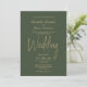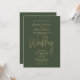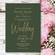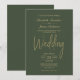 Una elegante invitación minimalista de bodas verdes con texto dorado.