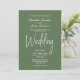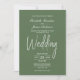 Una elegante invitación a la boda verde minimalista con texto blanco.