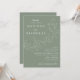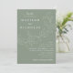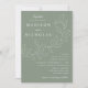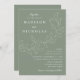 Invitaciones botánicas de boda con sus nombres y detalles bodas con letras blancas divididas por una vid de hojas esbozadas con un fondo verde sabio. Las elegantes invitaciones nupciales se coordinan con nuestra colección de bodas de Cascading Leaves.