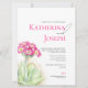Hermosa invitación de boda floral rosa de primula scotica alpina. Sombreado en rosa, verde, marrón y blanco. Edite esta invitación de flor de primavera rosa con sus propias palabras. Diseño único y pintura botánica original de acuarela de arte fino de Sarah Trett para www.mylittleeden.com