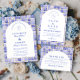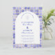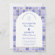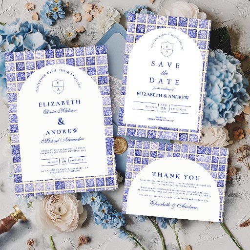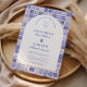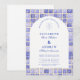 Un diseño atemporal en azul y blanco inspirado en el clásico porcelana Delft y los patrones de toile francés. El borde de baldosas de patchwork combina delicadas flores, rayas y motivos ornamentales que evocan cerámicas europeas vintage. Un suave panel arqueado en el centro mantiene el diseño refinado y elegante, permitiendo que los detalles del patrón inspirado en la porcelana enmarquen la celebración de manera hermosa. Perfecto para parejas que planean una boda sofisticada en azul y blanco con encanto europeo tradicional.