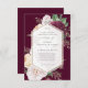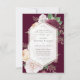 Una romántica y vintage invitación a la boda de otoño con hermosos botánicos y una forma geométrica moderna con marco dorado rosa y monograma de pareja.
