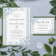 Hermosas flores de acuarela azul dibujadas a mano con abundante vegetación de viñas y hojas creando un hermoso patrón de rayas de fondo para esta encantadora invitación a la boda. Patrón de coordenadas en el lado inverso.