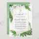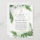 Hojas tropicales de color verde y blanco de moda y magnolias blancas en línea invitación a la ceremonia de boda virtual de larga distancia con marco geométrico de oro.
