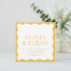 Invitación a una boda amarilla con un borde ondulado.