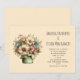 Una invitación de boda con una imagen linda. Flores azules, rosadas y crema con hojas verdes. Puesto dentro de una maceta verde con una tela de cuadros verde colgando del lado.