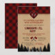 CUALQUIER EDAD. Diseño de tarjeta único con cuadros de búfalo rojos, silueta del bosque, un corazón de cuadros de búfalo rojo para monograma, hachas, hermosa escritura de FIESTA DE LEÑADOR Y JILL con efecto de cuadros rojos. Utilice la herramienta Personalizar para agregar su información. Para artículos coincidentes, visite mi fiesta de leñador y Jill.