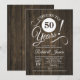Invitación rústica para fiesta de 50 aniversario con patrón de madera marrón oscuro. ¡Salud por 50 años! Perfecto para una celebración elegante.