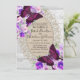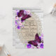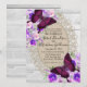 Estas hermosas invitaciones de boda de madera blanca y encaje presentan mariposas y flores moradas y rosas crema. Perfectas para una boda rústica de campo o para una celebración de boda DIY. Muy elegantes.