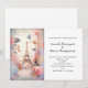 Una invitación de boda con una imagen estilizada de la torre Eiffel rodeada de hermosas mariposas y delicadas flores de jardín.