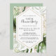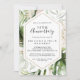 Esta invitación de aniversario de bodas de oro geométricas tropicales es perfecta para una celebración de boda moderna. El diseño presenta oro pintado a mano con acuarela y hojas de palma y plátano verdes con flores rosadas agrupadas en ramos, adornando un marco geométrico.