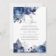 Invitaciones de aniversario de bodas de plata 25 azul marino y flores blancas con acentos de lámina de plata.