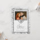 Hermosa invitación para invitar a veinticinco años de familiares y amigos a celebrar su aniversario de bodas de plata. Hecho en tonos plateados con acentos blancos de lino, todos con un efecto digital de hoja de plata falsa. Personalice con una foto de la pareja del 25 aniversario y personalice con todos los detalles del evento.