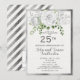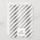 Elegante, vintage, blanco y plata con ramo floral blanco Invitación de aniversario de bodas de 25 años. La parte trasera de la tarjeta tiene rayas diagonales negras y plateadas.