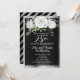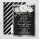 Elegante, vintage, negro y plata con ramo floral blanco invitación para fiesta de 25 aniversario de boda. La parte trasera de la tarjeta tiene rayas diagonales negras y plateadas.