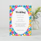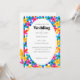 Estas invitaciones de boda fáciles de personalizar ofrecen una visión moderna del estilo retro con flores de margarita hippies en amarillo brillante, azul y rosa fucsia. Los gráficos dibujados a mano están diseñados para imitar el estilo de impresión clásico de risógrafo. Todo el texto de estas invitaciones está listo para su toque personalizado con una simple impresión en negro dentro de un marco ovalado blanco sobre un fondo floral colorido.